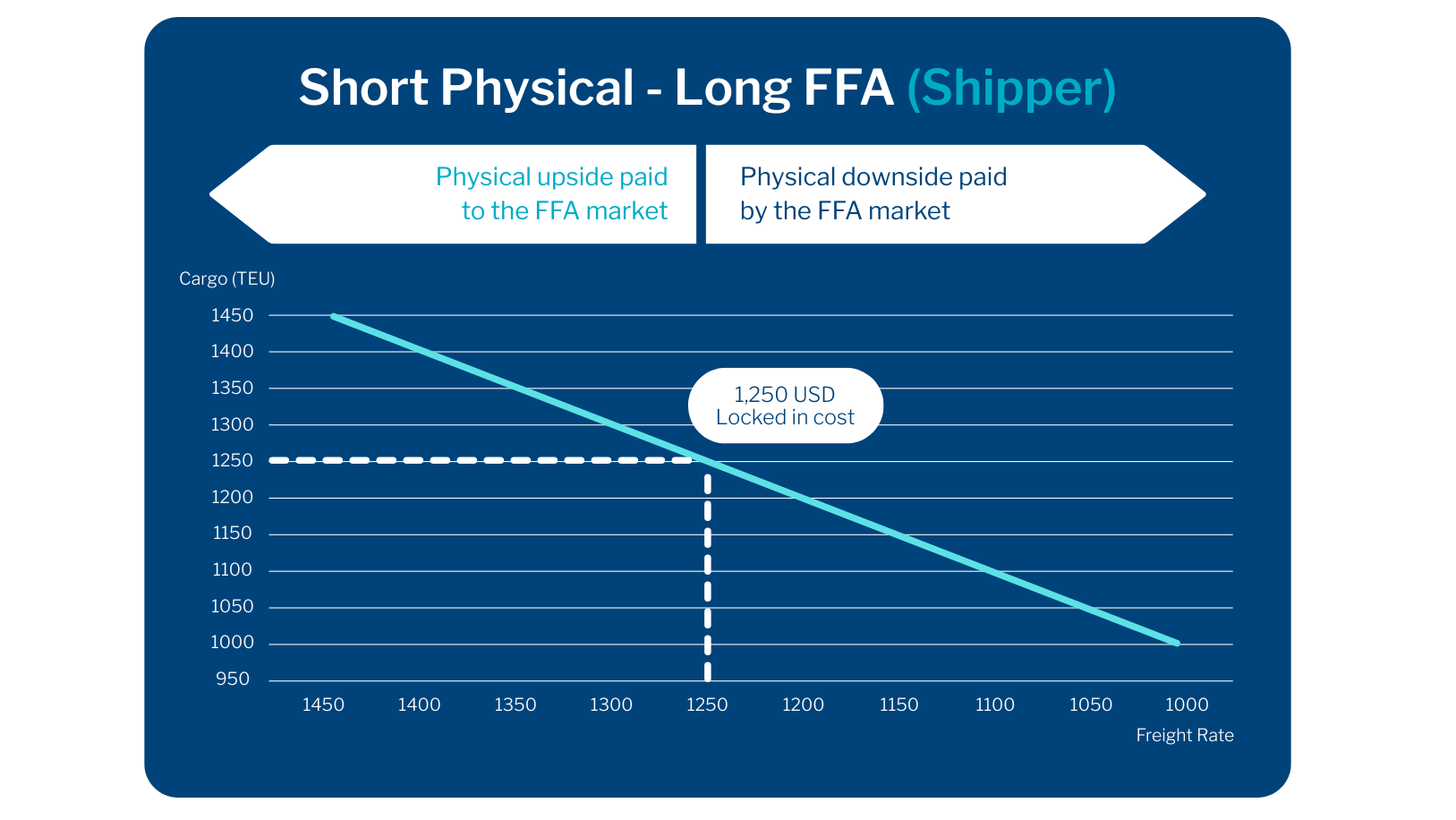 Similarly, a Cargo Owner is considered being short freight; they are seeking physical freight cover and will be concerned with the effect of freight rising. They will hedge by buying a forward contract – creating an opposing long position.